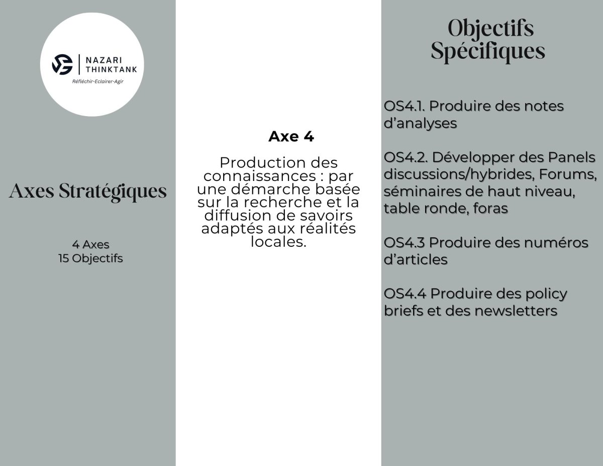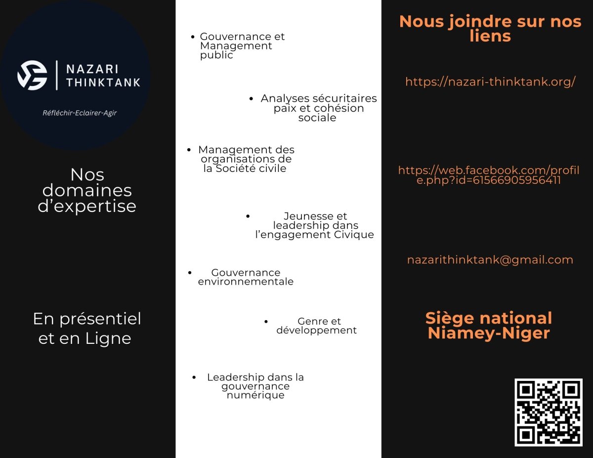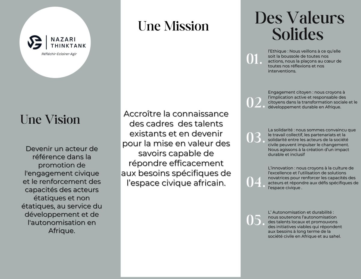 Pour remplir ces missions, NAZARI s’engage à produire les réflexions des experts, analystes et spécialistes sur les grands enjeux de notre époque: en éclairant les grands débats nationaux à partir de la connaissance de leurs problématiques au Niger et partout dans le monde, en identifiant et en fédérant les talents qui peuvent contribuer à la réflexion et participer par leur action personnelle à l’évolution de la société, et en réunissant ces acteurs autour des valeurs et d’une éthique affichée par le centre et qui font l’objet d’une charte annexée au règlement intérieur.